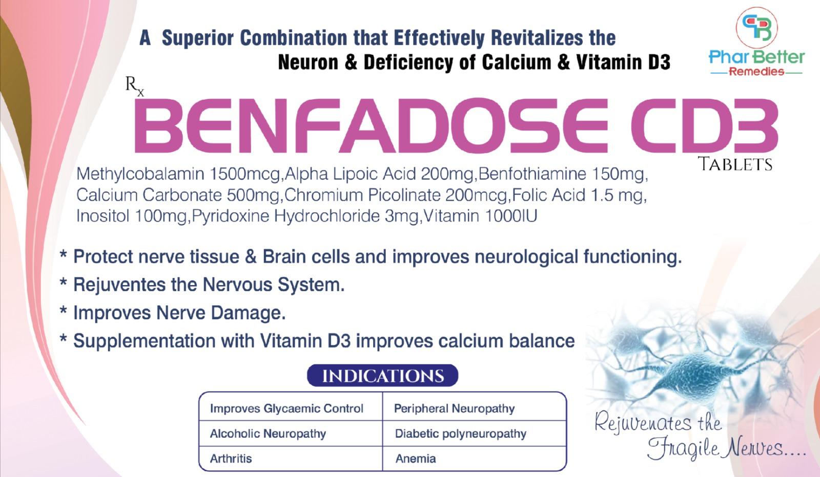 Introducing BENFADOSE CD3, a superior formulation designed to protect nerve tissues, enhance brain function, and address calcium & vitamin D3 deficiencies. This scientifically crafted combination ensures comprehensive neurological and skeletal support.