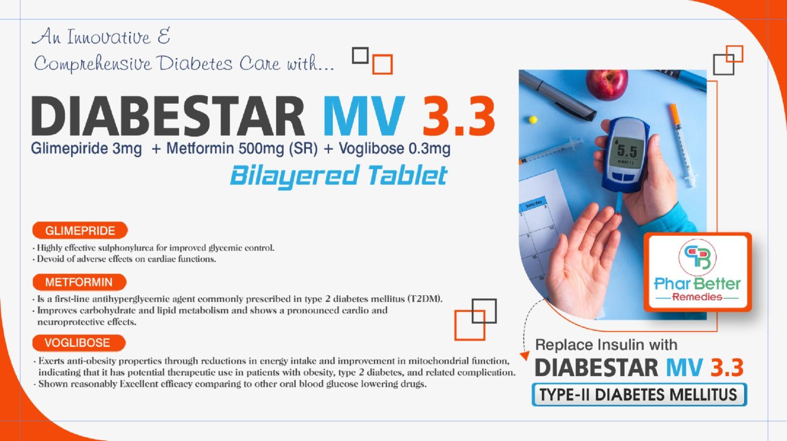 At PharBetter Remedies, we bring innovative and patient-friendly solutions for better diabetes care. With DIABESTAR MV 3.3, patients can achieve stable blood sugar levels and improve their quality of life.