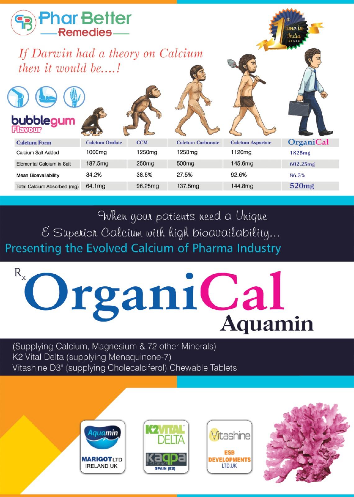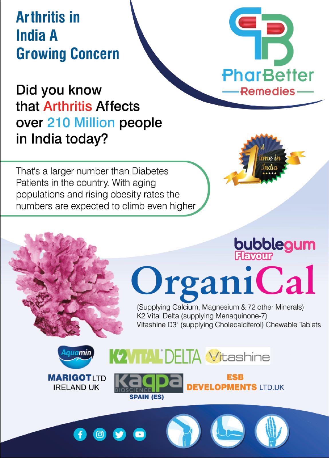 Introducing OrganiCal, a breakthrough calcium supplement featuring a unique blend of Aquamin Calcium, Vitamin K2 Delta, and Vitashine D3, along with 72 essential marine minerals. Designed to support bone health and overall wellness, OrganiCal is the first-of-its-kind in India, now available in a delicious bubble gum flavor.